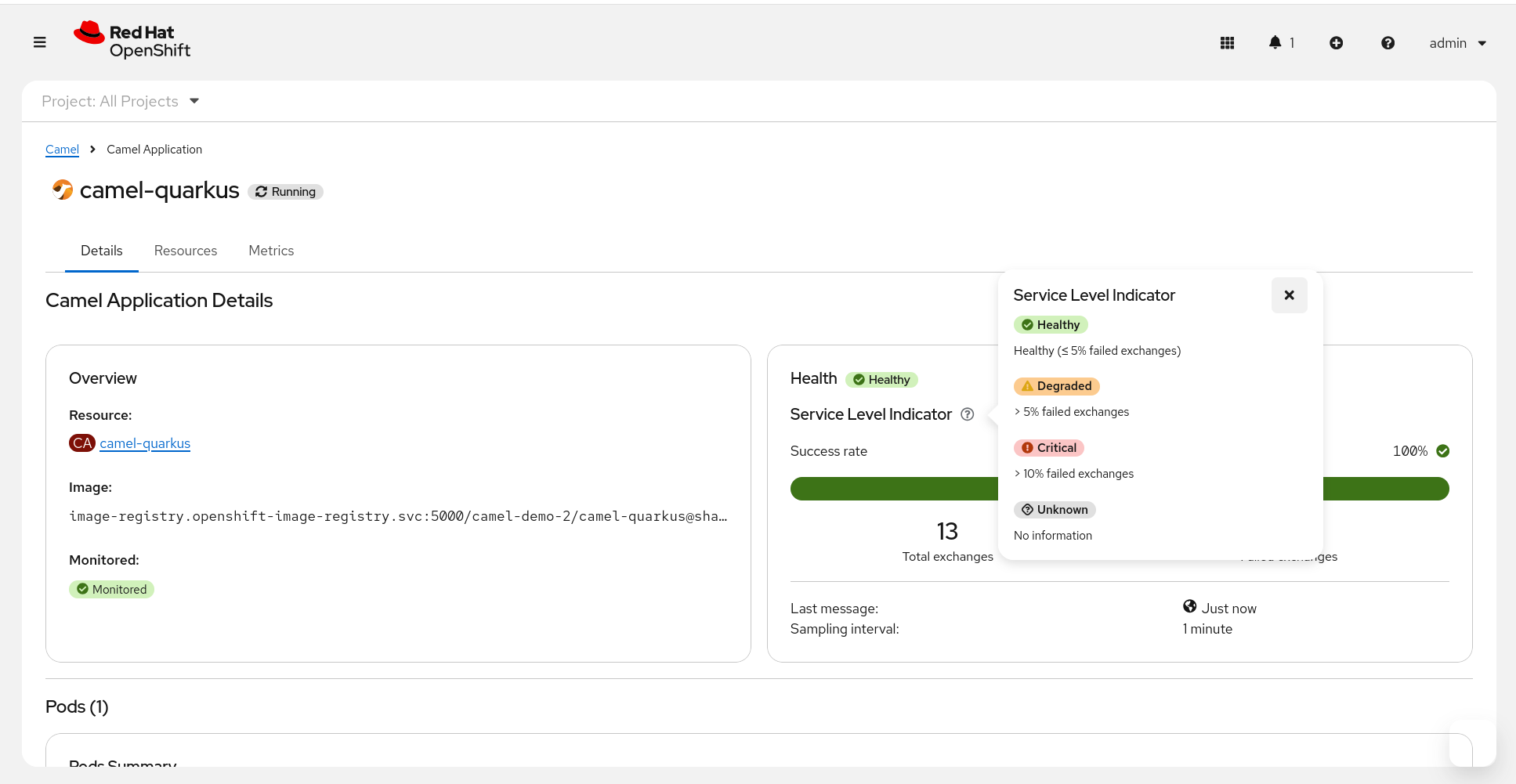 The Camel Application page will show informations and metrics for the chose deployed Camel Application