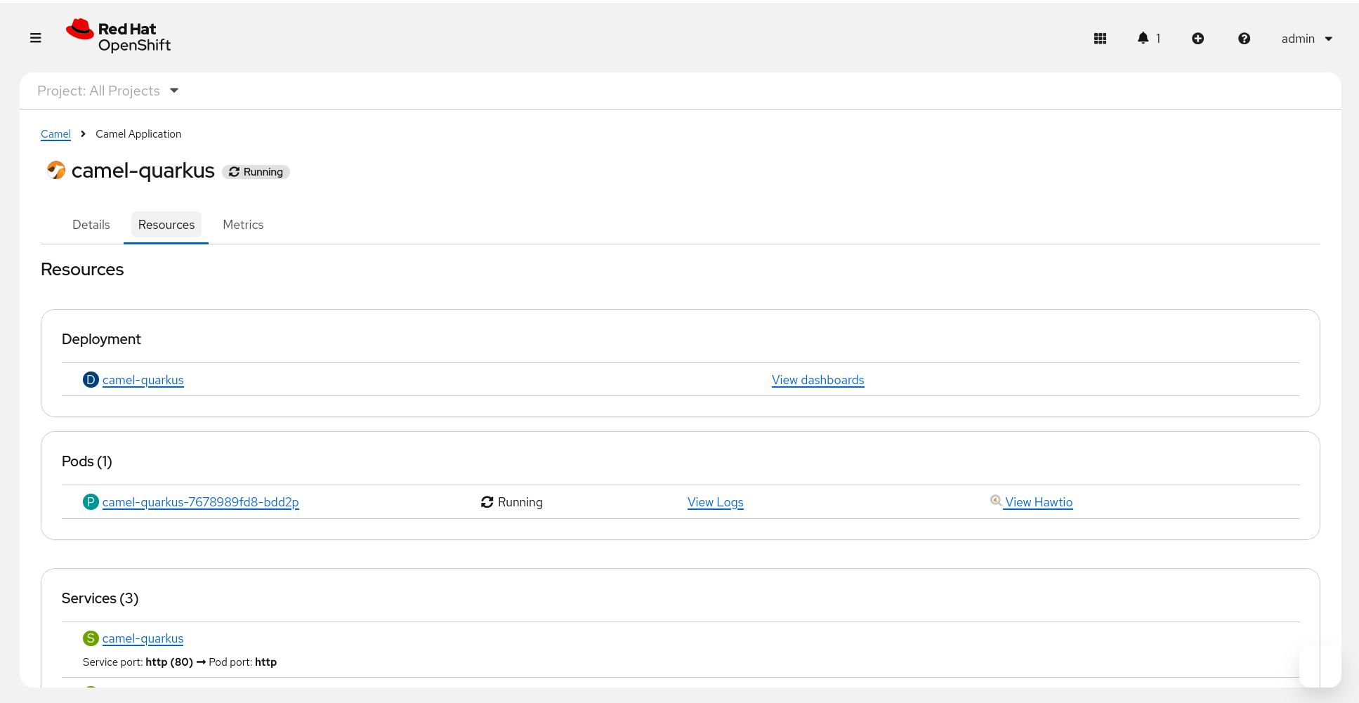 - Kubernetes native resources linked to the deployment, with some acces to logs, hawtio console, etc