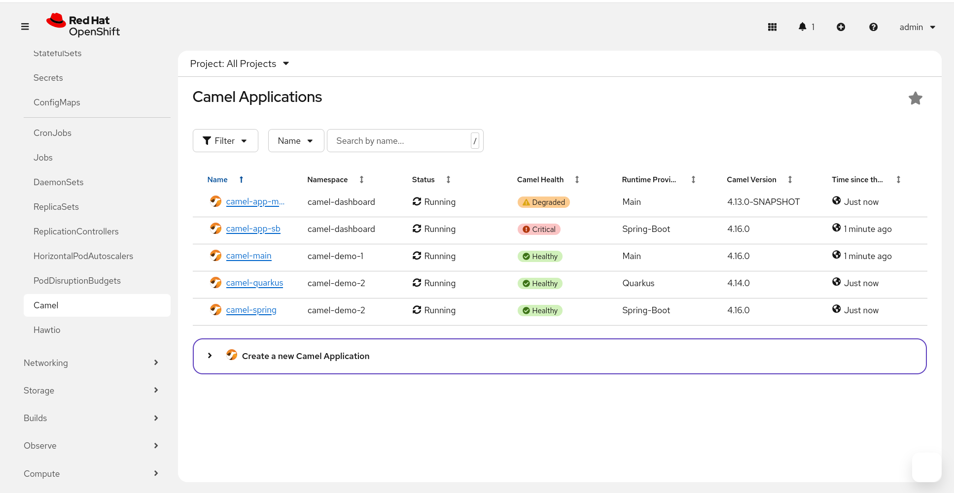 - The Camel Applications page displays the list of your deployed Camel Applications. It is available as a