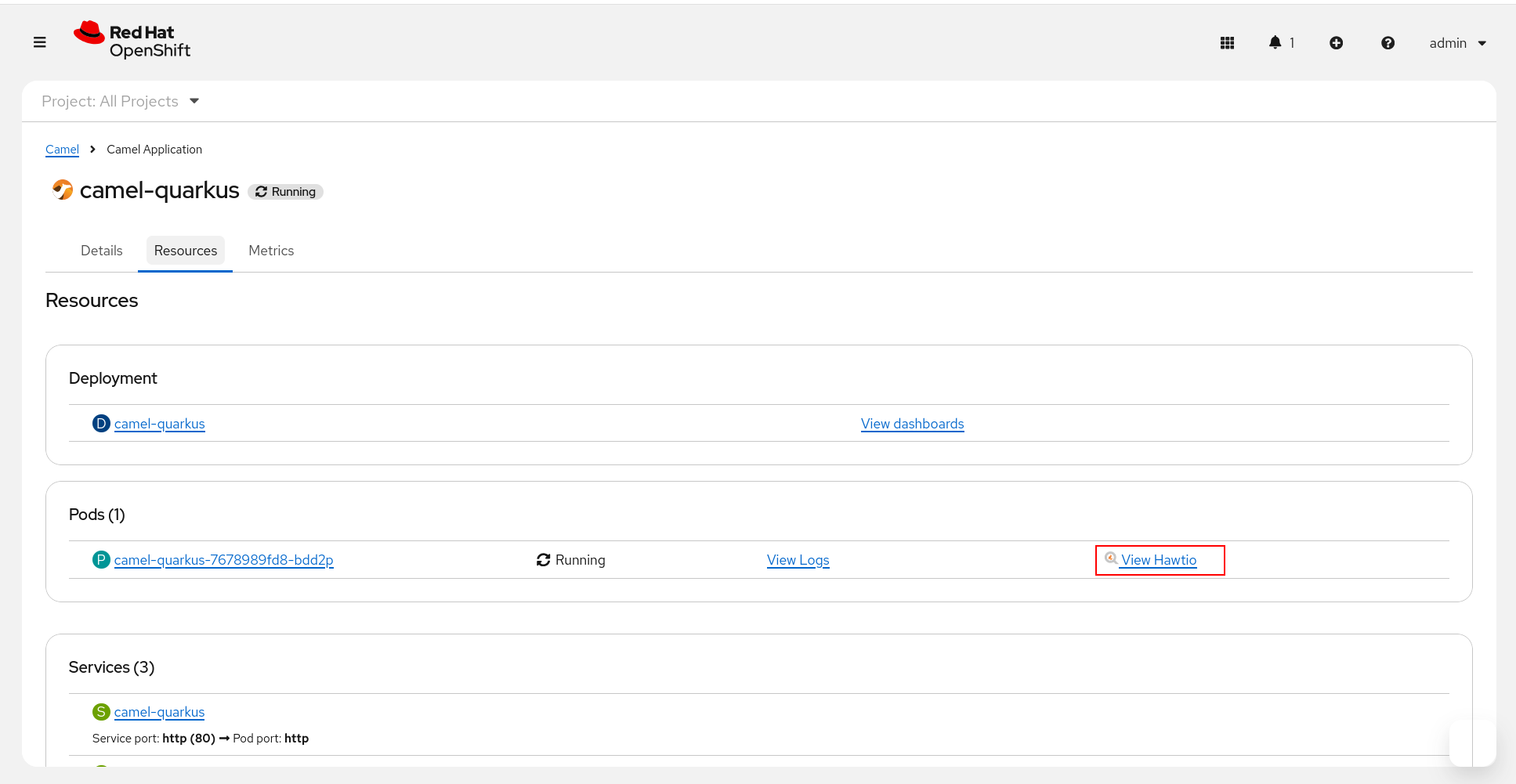 By default the HawtIO Console Plugin for Openshift offers the features from the HawtIO Online console into the Openshift.