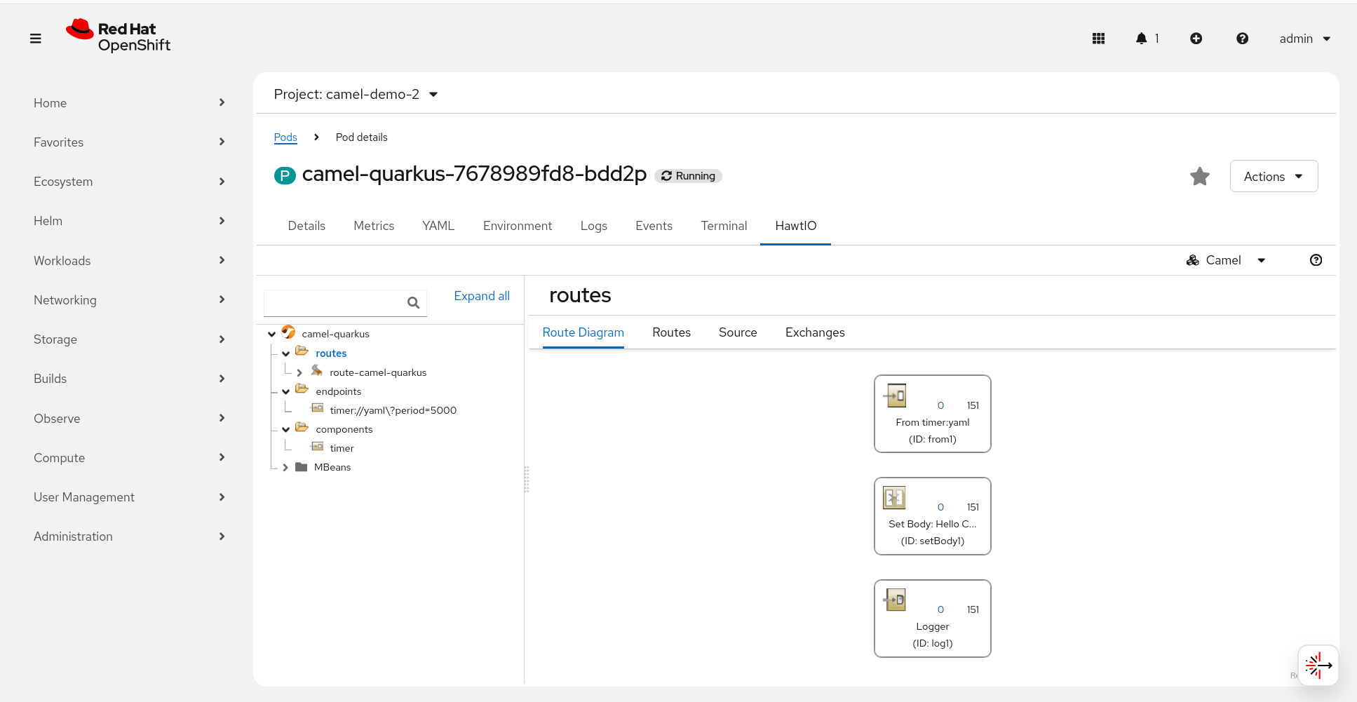 HawtIO is a powerful pluggable Web management console that provides its build-in plugin that supports Apache Camel.