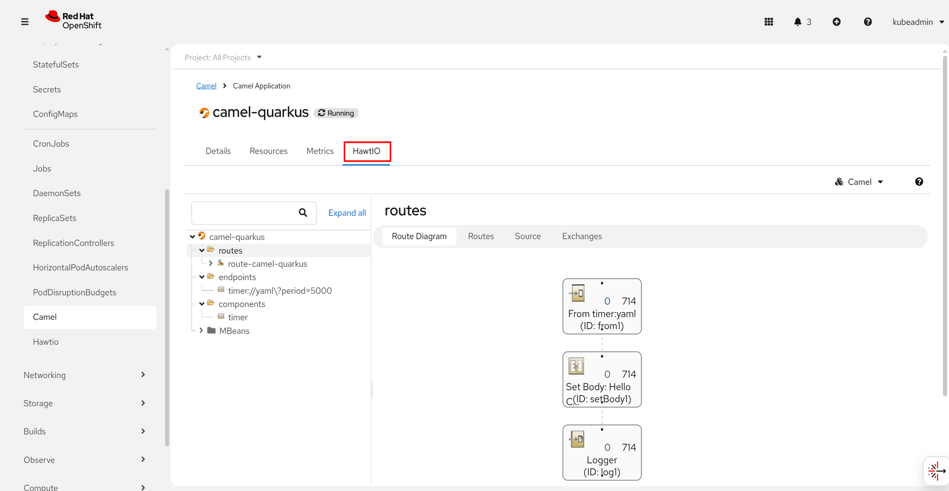 Starting from Openshift 4.21 Camel Dashboard detail view shows additional HawtIO tab: